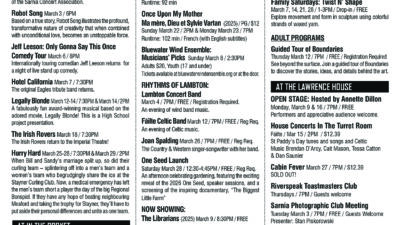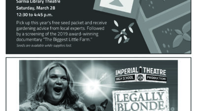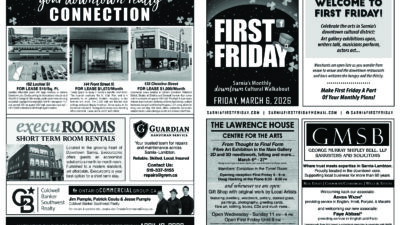 Grab a rain jacket because spring is springing and there is a chance of rain on First Friday, March 6th. Head downtown to enjoy all of the arts and culture events happening in Downtown Sarnia, from the Legion and Grind kitchen + bar in the North, to the Sarnia Library and the Lawrence House in the South. Check out the map above for FREE parking information.
