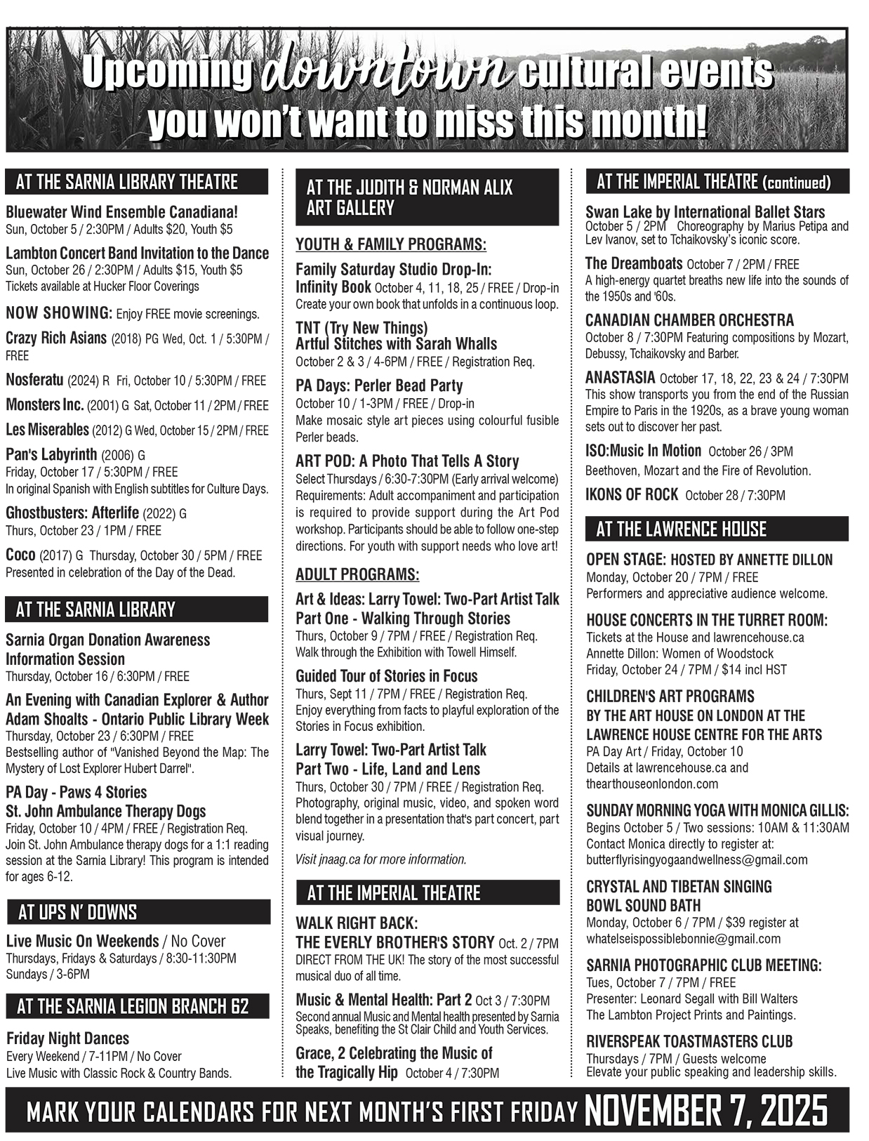 Our never ending summer continues through First Friday this week, so take advantage by strolling downtown Sarnia to take in all of the great arts and culture events!