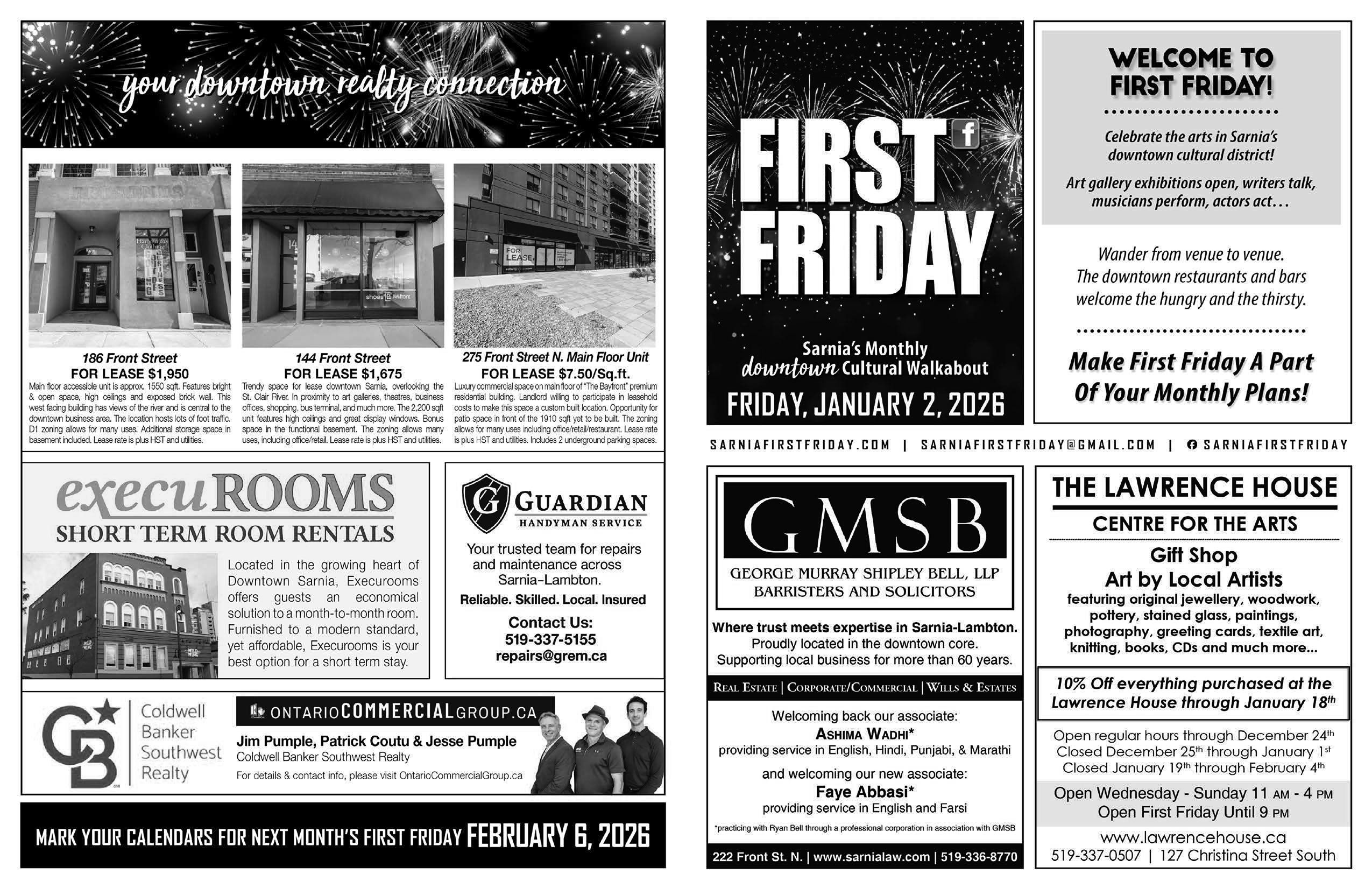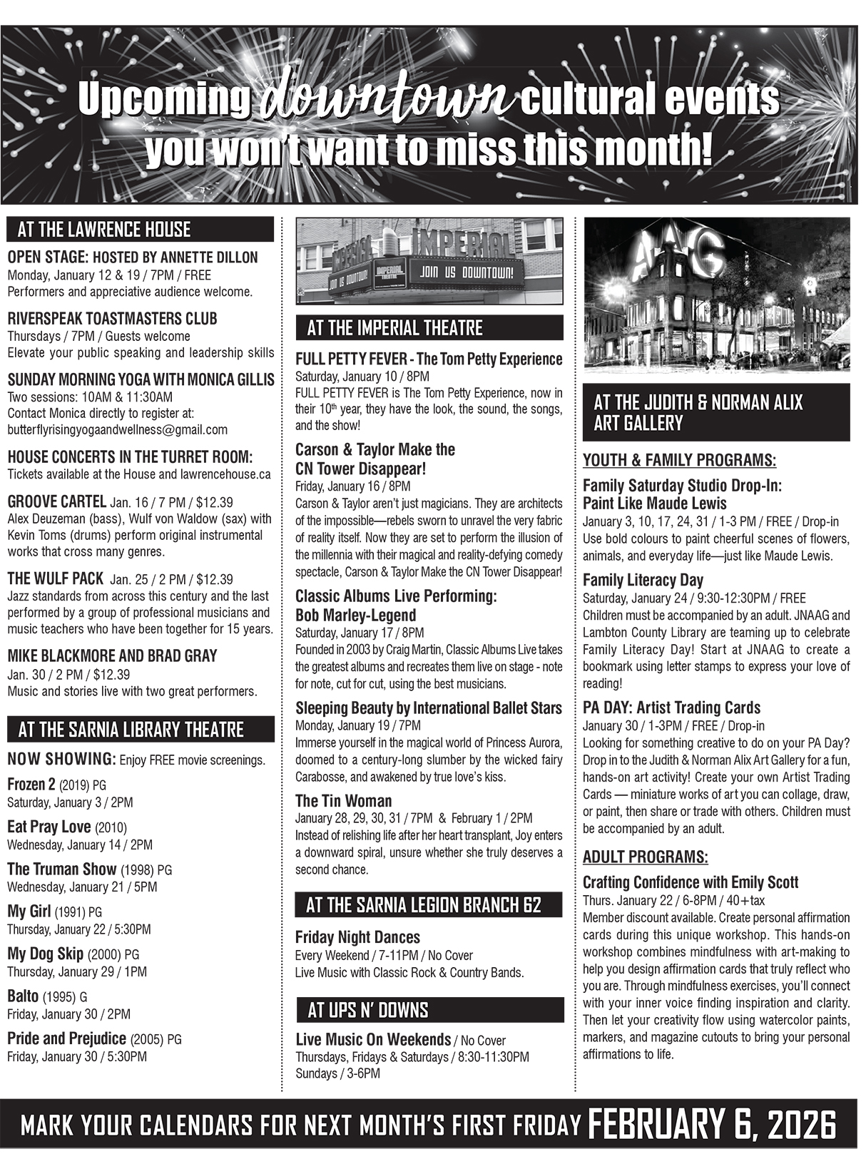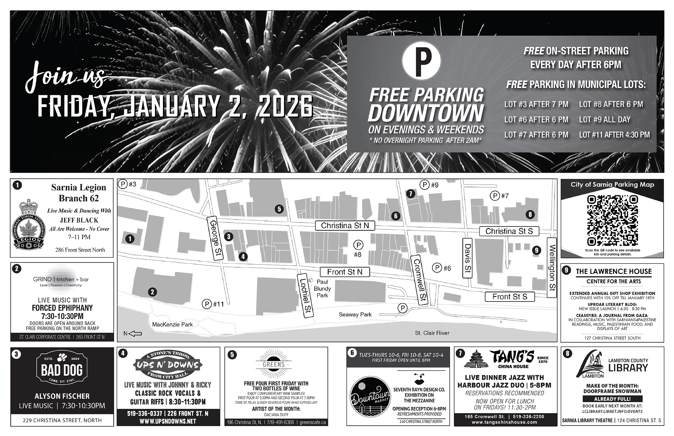 First Friday January 2nd, 2026 lets you keep partying into the New Year! Walk Downtown Sarnia to catch all of the music, art and poetry at the various venues from the Legion in the North to the Lawrence House in the South. Downtown road construction is done for the winter, so all intersections are now open and parking is easy.
