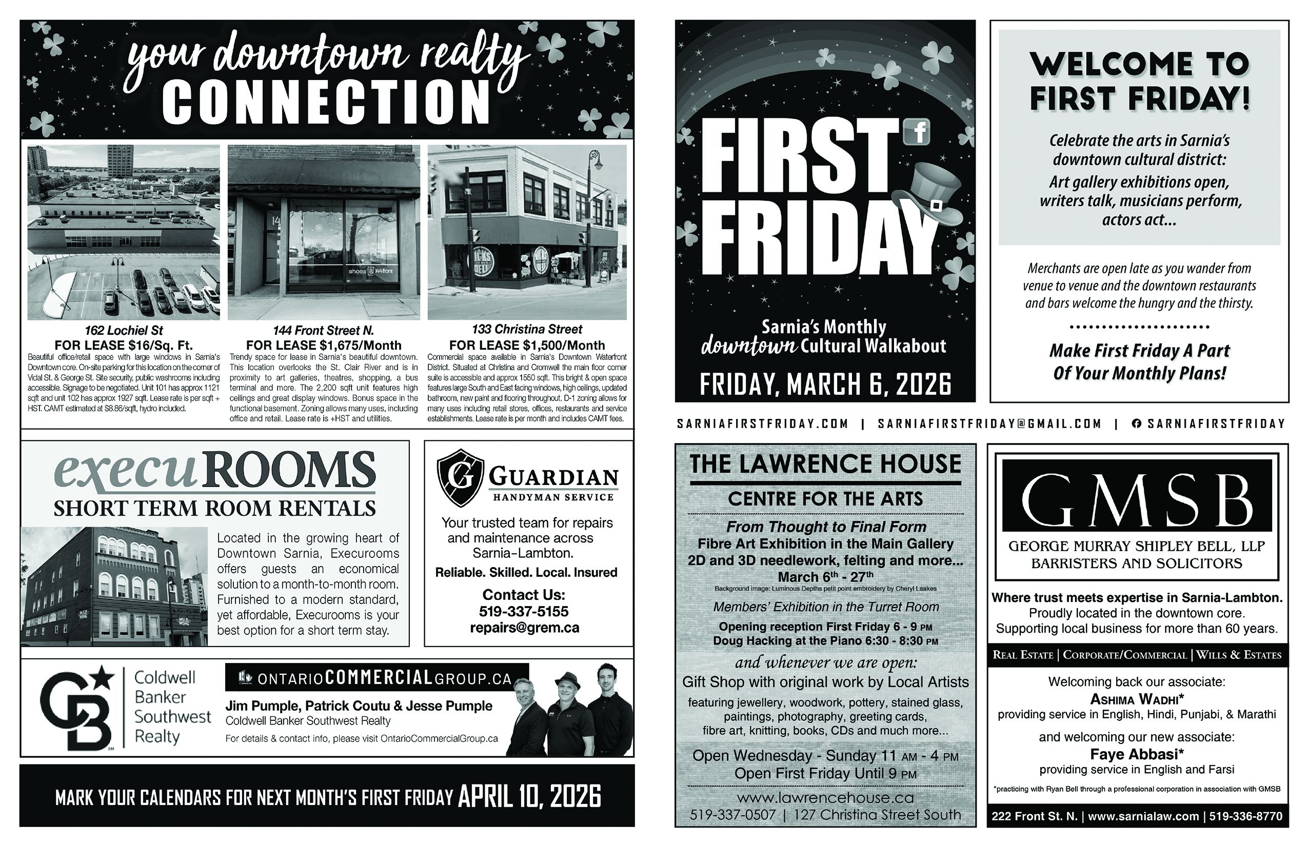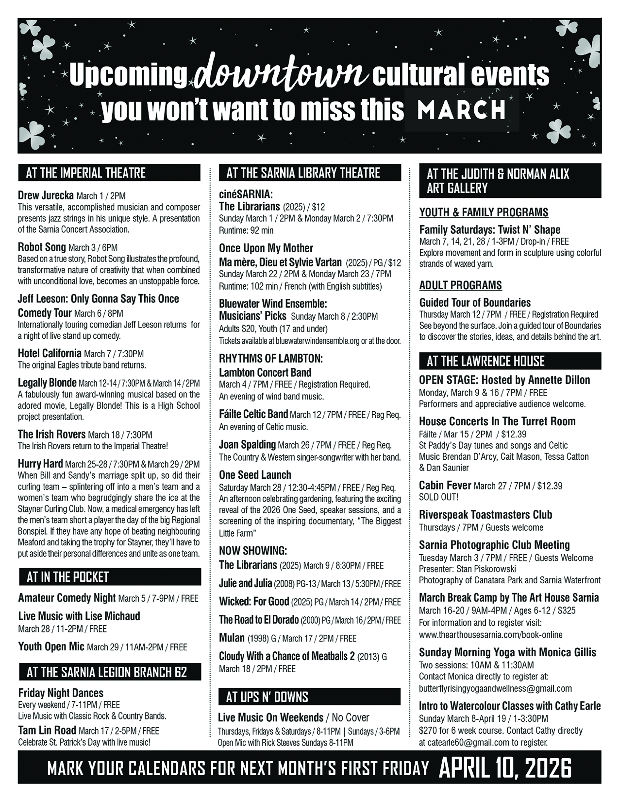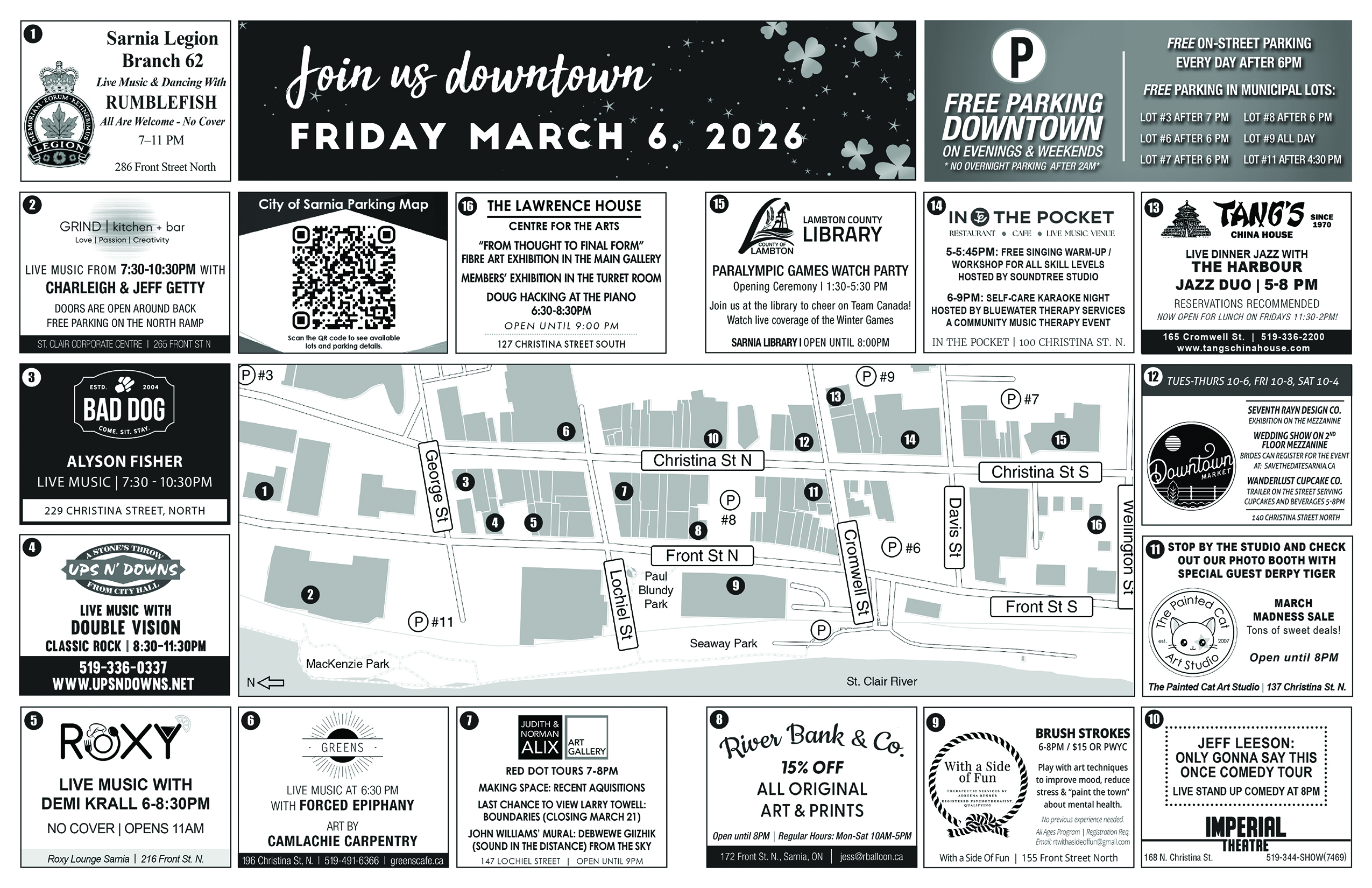 Grab a rain jacket because spring is springing and there is a chance of rain on First Friday, March 6th. Head downtown to enjoy all of the arts and culture events happening in Downtown Sarnia, from the Legion and Grind kitchen + bar in the North, to the Sarnia Library and the Lawrence House in the South. Check out the map above for FREE parking information.